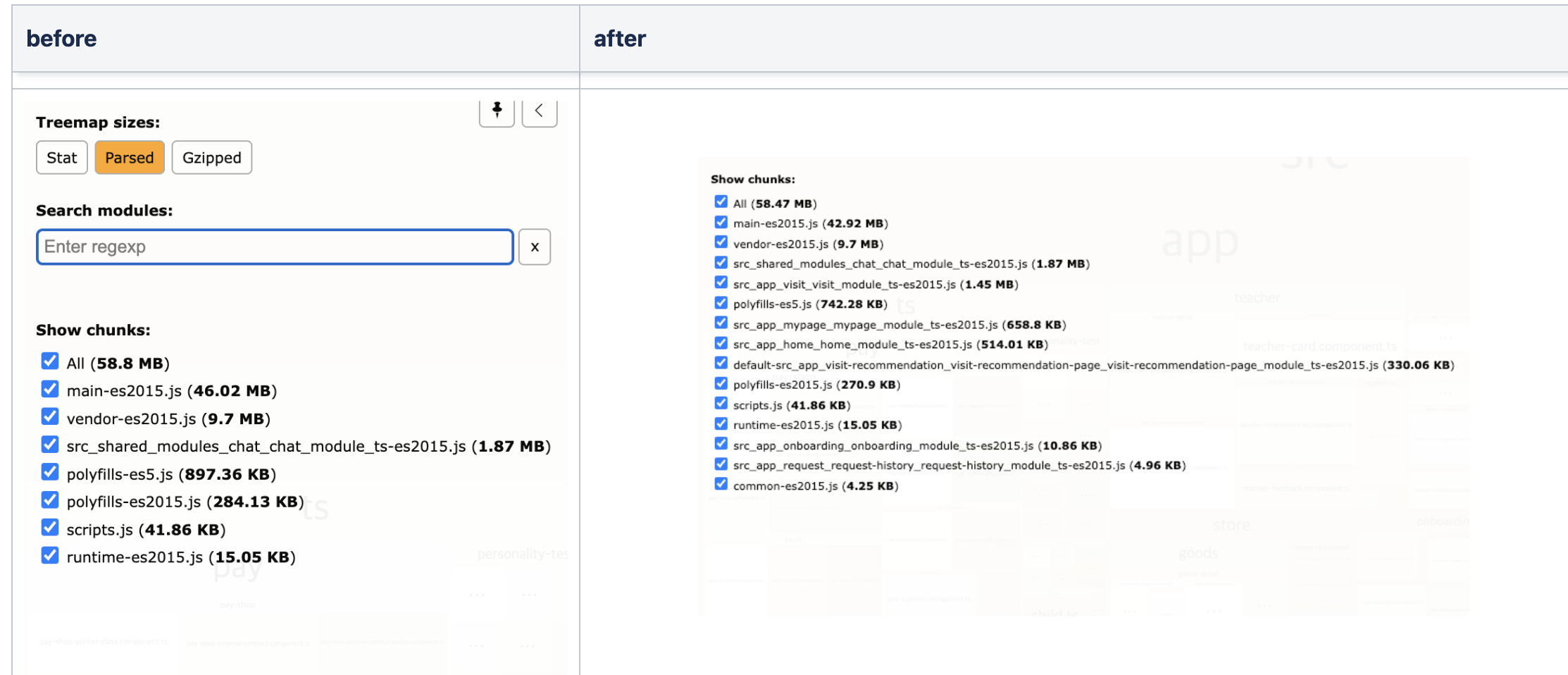 app-module 에 import 한 모듈은 lazy-loading 처리를 해도 첫 진입시에 즉시 로드되기 때문에 공통으로 사용되는 컴포넌트, 파이프 등도 모듈화를 시키고 각 기능에 문제를 발생시킬 수 있는 사이드 이펙트도 고려해야 했습니다.