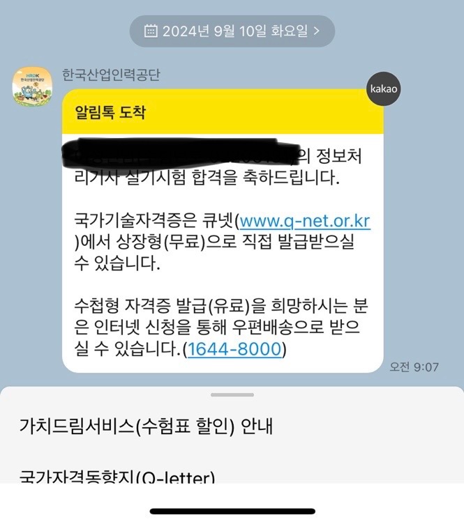 시험비는 자격시험치고 비싼편은 아니지만.. (aws 쿠버네티스 자격증은 몇십만원이다) 시험 접수 광클과 시험을 보러가는 것은 매우 귀찮으니 한번에 합격하길 기원한다. 합격 문자는 카톡으로 아래와 같이 온다. (불합격 문자는 카톡 내역에 없는데 기억으로는.. 문자로 왔던 것 같다)