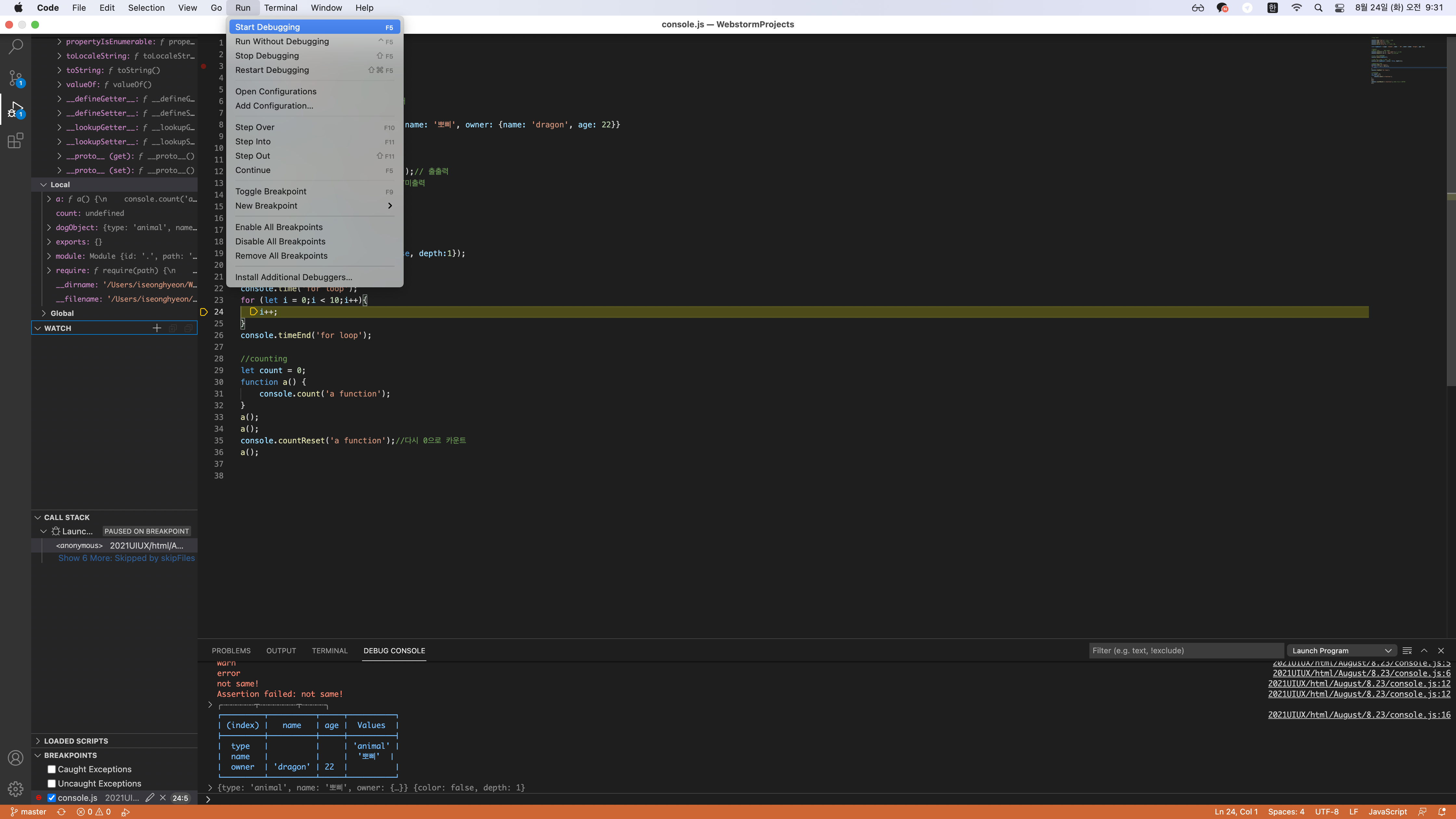 왼쪽의 메뉴에서 각 변수의 값을 확인하면서 디버깅을 진행할 수 있습니다.